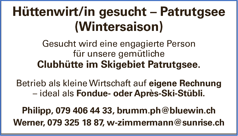 Hüttenwirt/in gesucht – Winter am Patrutgsee!